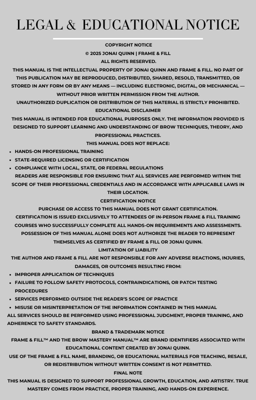 This manual focuses on the theory, structure, and professional standards behind brow lamination, waxing, and tinting. It is designed to help artists strengthen their knowledge, improve confidence, and better understand the why behind each step of the service process.